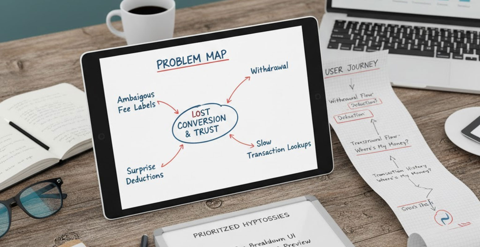 We began by listening — to users, support logs, and finance. Our discovery combined quantitative analysis of wallet events and failure points with qualitative interviews to uncover where users got confused. We prioritized problems that hurt both conversion and trust: ambiguous fee labels, surprise deductions during withdrawals, and slow transaction lookups. Early artifacts included a problem map, user journey with pain points highlighted, and a prioritized list of hypotheses to validate.